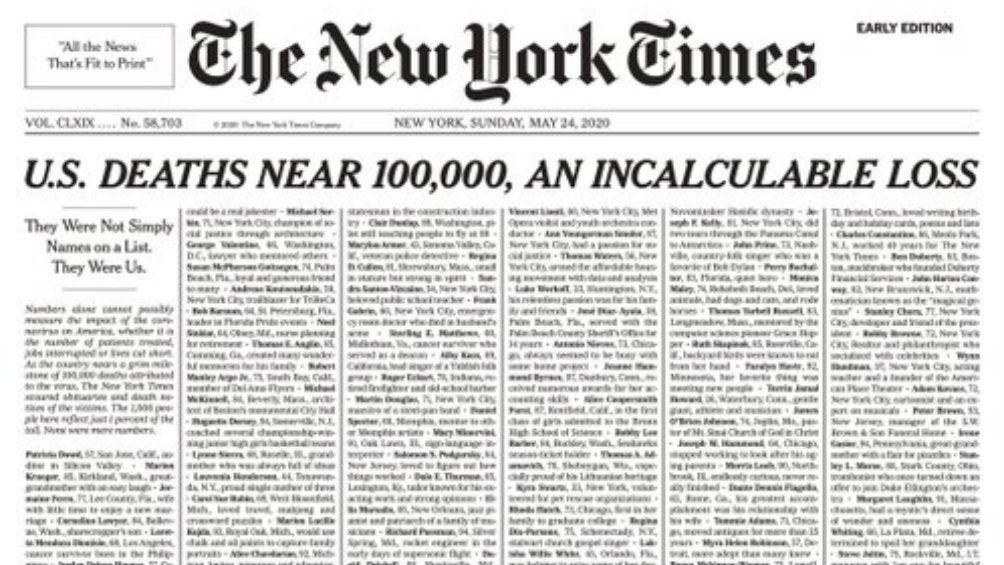 The New York Times, diario más prestigioso de Estados Unidos, anticipó la portada de la edición del domingo 24 de mayo haciendo dedicatoria a mil de las víctimas que ha tomado el virus, colocando sus nombres en homenaje bajo el encabezado: "Las muertes en Estados Unidos son casi 100 mil, una pérdida incalculable".