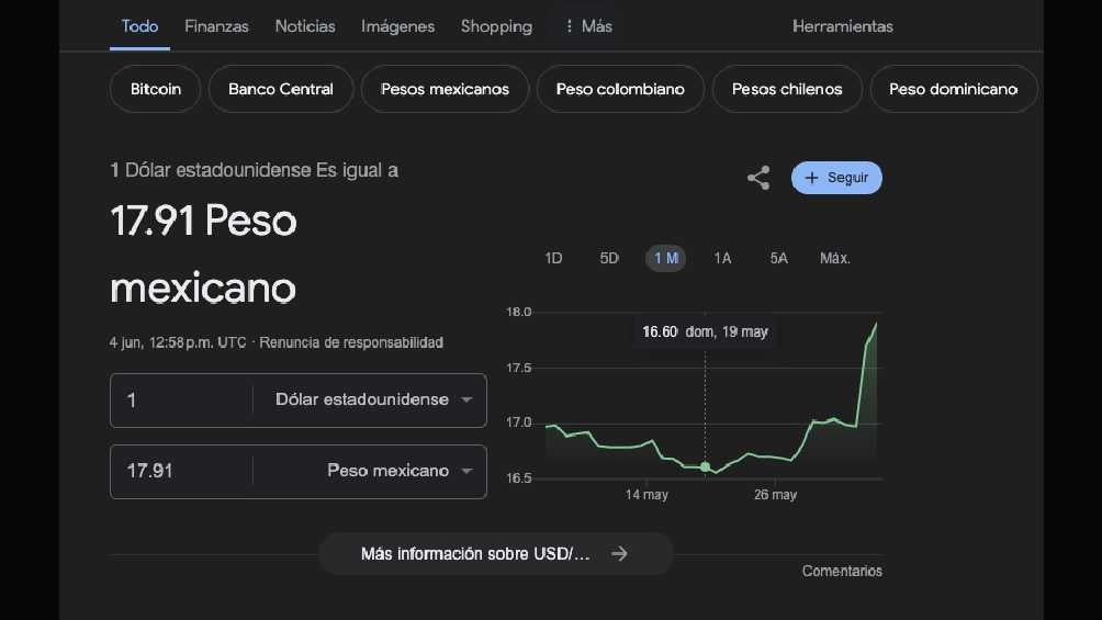 Este martes 4 de junio el dólar se cotiza en $17.91 pesos, lo que significa que la moneda mexicana volvió a perder terreno frente a la divisa estadounidense, tomando en cuenta su precio al inicio de la jornada anterior que fue de $17.47 pesos.