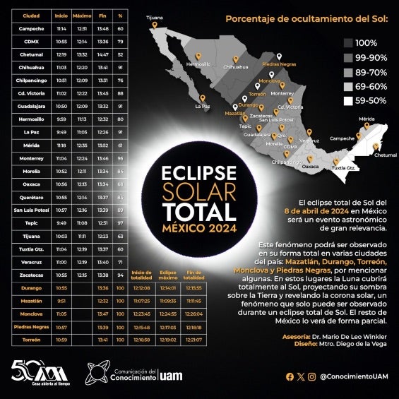 En la tabla que hizo la UAM, podrás encontrar el horario de inicio y término, así como el del punto máximo del eclipse y el porcentaje de obscuridad que habrá en cada ciudad, incluyendo Mazatlán, Durango, Torreón, Monclova y Piedras Negras, sitios donde el eclipse se podrá ver en su totalidad, pero las autoridades recomiendan hacer caso a los consejos e indicaciones para percibir el fenómeno solar.
