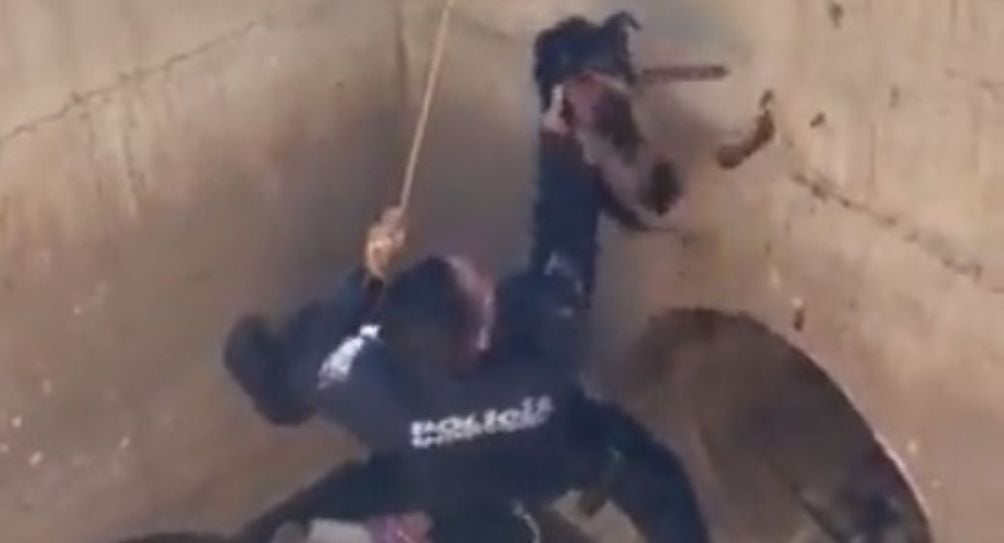 A través de redes sociales se hizo viral en el que los policías acuden al lugar para rescatar al animal. Uno de ellos se amarró una cuerda en la cintura y, auxiliado por su compañera, bajó y sacó al ser vivo que estaba atrapado.