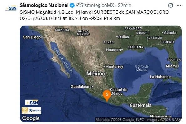 La información preliminar del Sismológico Nacional ha arrojado que el sismo tuvo una magnitud de 6.5 con epicentro a 15 km del suroeste de San Marcos, Guerrero.