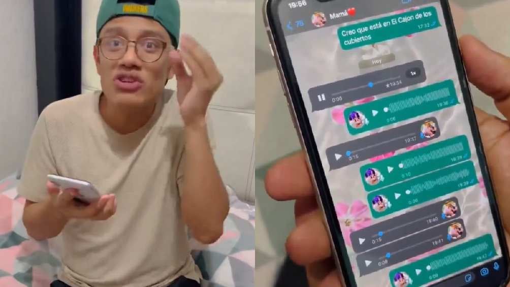 En la grabación se observa que el joven tiene el chat abierto con el contacto de su mamá en WhatsApp, quien supuestamente le envía una nota de voz pidiéndole dinero porque se metió en un problema, sin embargo, le dice que le mande el dinero a la cuenta de una amiga ya que en ese momento no lleva su tarjeta bancaria para hacer un retiro.