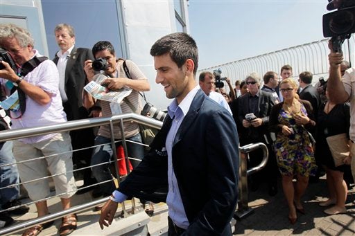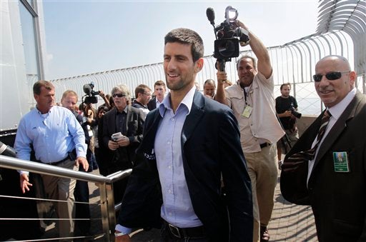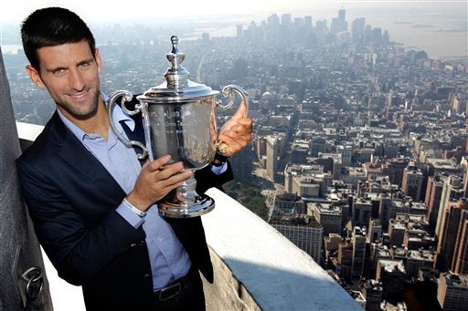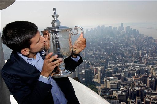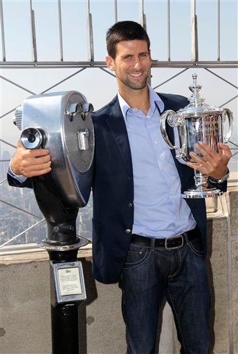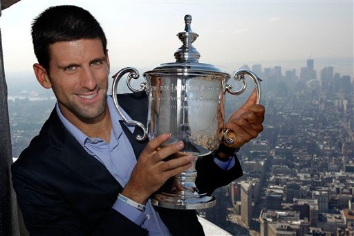 Djokovic disfruta la vista desde el Empire State al lado de su trofeo. FOTO: AP