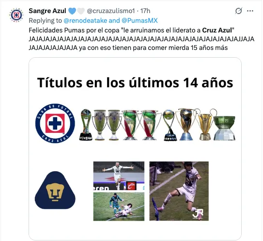Otro factor que elevó la crispación fue la percepción de que Pumas dejó pasar una oportunidad clara para entrar al Play-In, lo que reforzó la narrativa celeste de que el equipo universitario lleva años sin consolidar un proyecto competitivo. Esta sensación fue utilizada por cuentas de aficionados cementeros para destacar la brecha deportiva que, según ellos, existe actualmente entre ambos clubes.