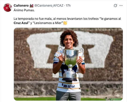 “SE ACABOOO, PUMAS ES CAMPEON DE LA COPA "Lesionamos a Kevin Mier" !!”, ‘Pumas ya no es grande’, ‘felices 15 años’, fueron unas de las tantas burlas que recibió el equipo dirigido por Efraín Juárez.