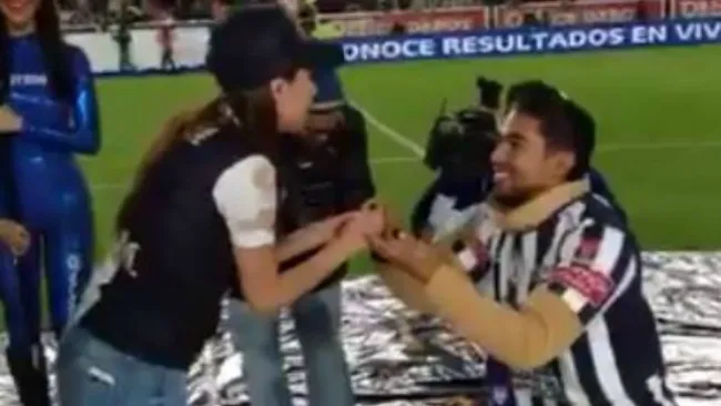 El hombre vestido de 'Pachus' se arrodilló en la media cancha y luego de dirigir unas palabras a su novia, que se encontraba sorprendida por lo que estaba pasando, entregó el anillo de compromiso lo que generó el aplauso por parte del público y una profunda alegría a su pareja.