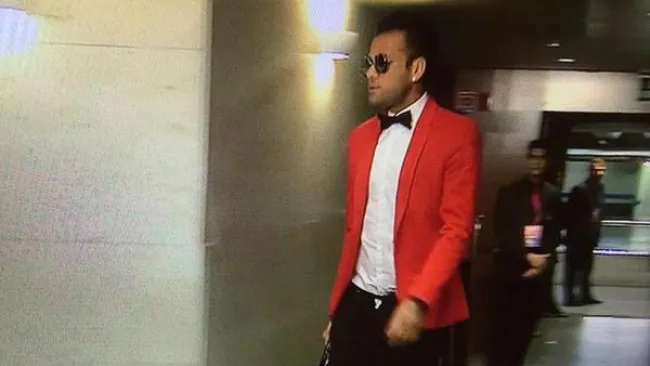 Dani Alves, lateral del Barcelona, sorprendió a su llegada al Camp Nou, pues lució un colorido traje rojo, moño en el cuello, combinado con una especie de short.