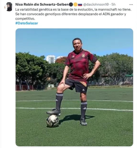 "La variabilidad genética es la base de la evolución, la mannschaft no tiene. Se han convocado genotipos diferentes desplazando el ADN ganador y competitivo", escribió Salazar a través de su cuenta de X, generando de inmediato conversación entre los usuarios. Dicha publicación termina con la ya conocida frase del analista #DatoSalazar.