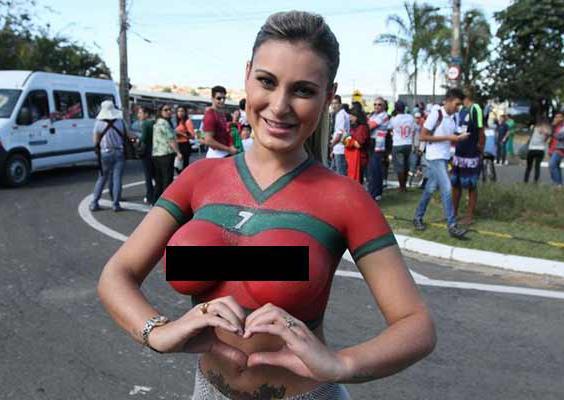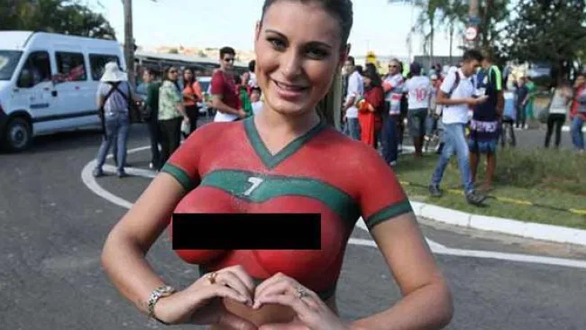 Andressa, que actualmente es una de las presentadoras del programa 'Muito Show', dejó al descubierto sus senos, a pesar de haberse cubierto con pintura, simulando la playera de Portugal.