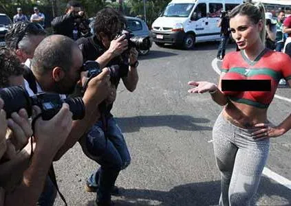 Con un bodypainting, la modelo, quien asegura haber tenido una aventura con el jugador merengue, Cristiano Ronaldo, esperó su llegada a Brasil para darle una calurosa bienvenida.