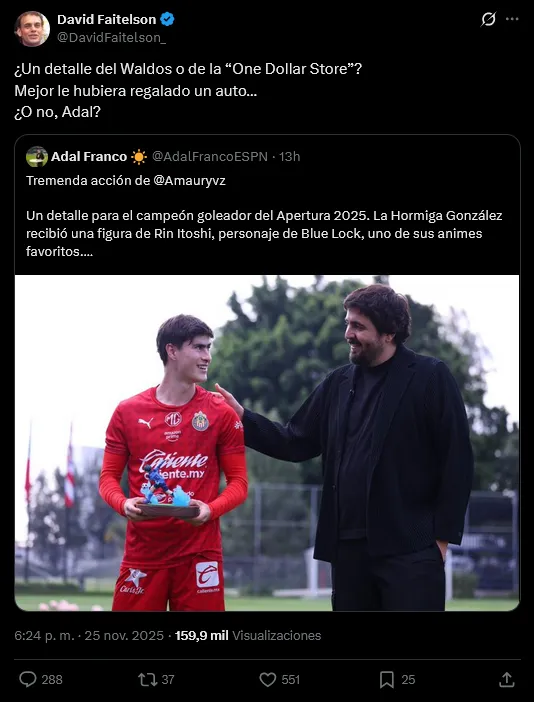 "¿Un detalle del Waldos o de la 'One Dollar Store'?", escribió Faitelson de forma irónica, comparando el regalo con artículos de bajo precio. El comunicador no se detuvo ahí, sino que sugirió un premio de mayor calibre para un campeón de goleo: "Mejor le hubiera regalado un auto..."