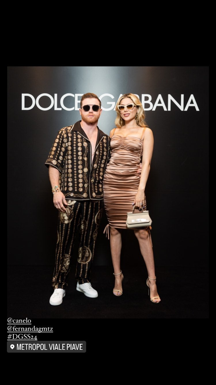 El campeón mexicano, Saúl "El Canelo" Álvarez, y su esposa Fernanda Gómez fueron invitados especiales en la Semana de la Moda de Milán, donde ocuparon las primeras filas en la pasarela de la firma italiana Dolce & Gabbana. El pugilista, quien ha mantenido una estrecha relación con la marca, lució un atuendo de la nueva colección de primavera-verano 2024, mientras que Fernanda deslumbró con un minidress dorado en seda.