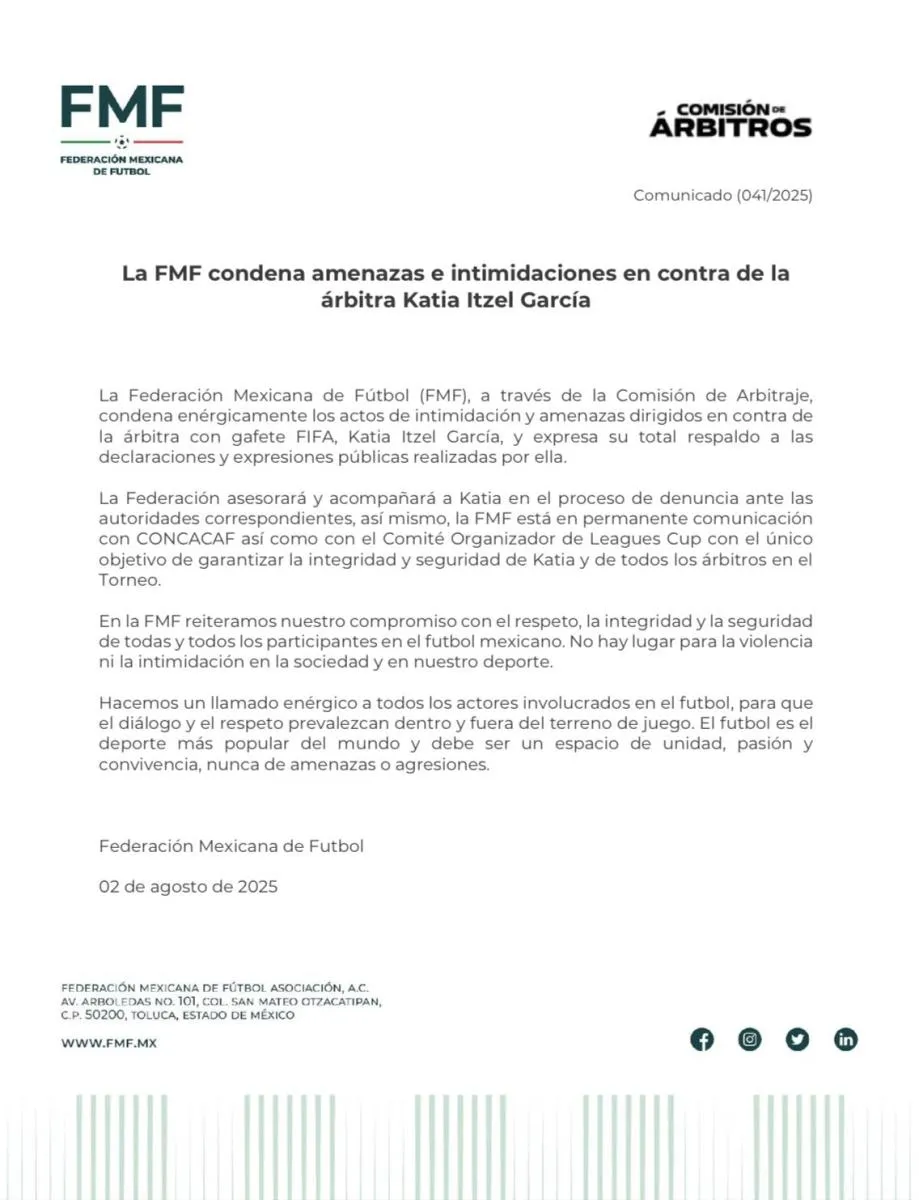 Luego de que la árbitra mexicana hiciera público un problema en el que le hicieron llegar amenazas de muerte después del partido de Monterrey vs Cincinnati , la Comisión de árbitros y la FMF emitieron un comunicado de total apoyo a Katia Itzel, algo que enojó al 'Cantante', quien no tardó en expresarse en redes sociales.