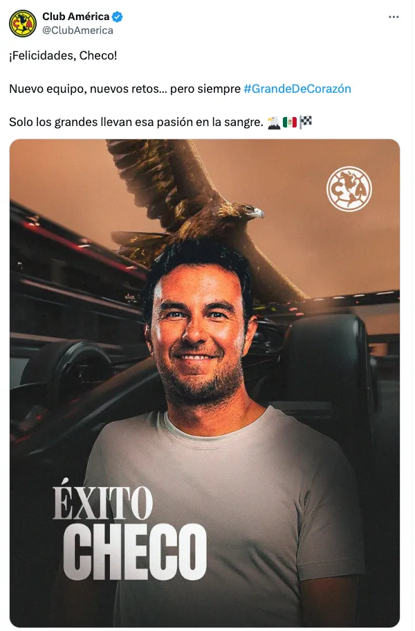 "¡Felicidades, Checo! Nuevo equipo, nuevos retos… pero siempre Grande de Corazón . Solo los grandes llevan esa pasión en la sangre", se lee en la publicación de las Águilas.