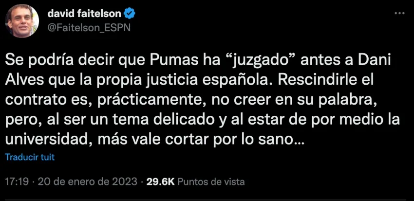 “Se podría decir que Pumas ha 'juzgado' antes a Dani Alves que la propia justicia española. Rescindirle el contrato es, prácticamente, no creer en su palabra, pero, al ser un tema delicado y al estar por medio la Universidad, más vale cortar por lo sano”, agregó.