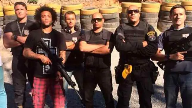 Marcelo, jugador brasileño del Real Madrid posó hace unos días junto a elementos armados, durante una visita al Batallón de Operaciones Policiales Especiales, en Laranjeiras, Río de Janeiro.