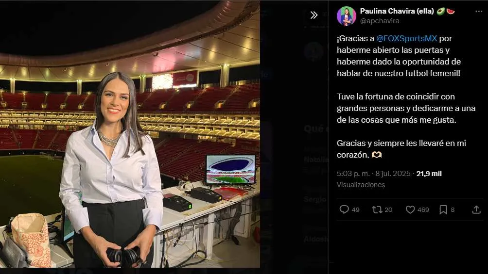 En su mensaje de despedida, publicado en redes sociales, expresó: “¡Gracias a FOX Sports MX por haberme abierto las puertas y haberme dado la oportunidad de hablar de nuestro futbol femenil! Tuve la fortuna de coincidir con grandes personas y dedicarme a una de las cosas que más me gusta. Gracias y siempre les llevaré en mi corazón.”