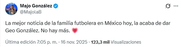 La noticia generó una oleada de reacciones en el gremio deportivo, especialmente entre figuras de TUDN, quienes celebraron la valentía de Geo. La narradora Majo González expresó su alegría con un mensaje contundente en redes, asegurando que era “la mejor noticia de la familia futbolera en México”. Sus palabras fueron replicadas por cientos de usuarios que compartieron mensajes de apoyo y solidaridad, reconociendo el esfuerzo y la resiliencia de la comunicadora.