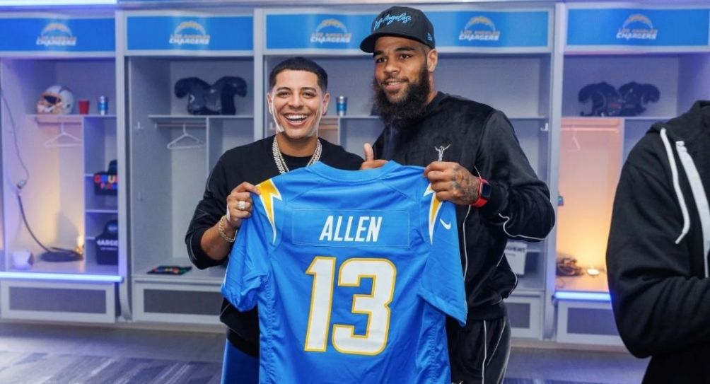 Asimismo, el equipo compartió fotografías en su sitio web en donde se ve a Eduin Caz, vocalista de Grupo Firme, utilizando el casco del mariscal de campo, Justin Herbert.