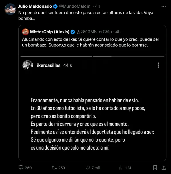 Periodistas españoles cercanos a Iker Casillas como lo son ‘MisterChip’ y Julio Maldonado (Mundo Maldini), reaccionaron al intrigante mensaje de portero campeón del Mundo y catalogaron como una ‘bomba’ el secreto que se está por revelar.