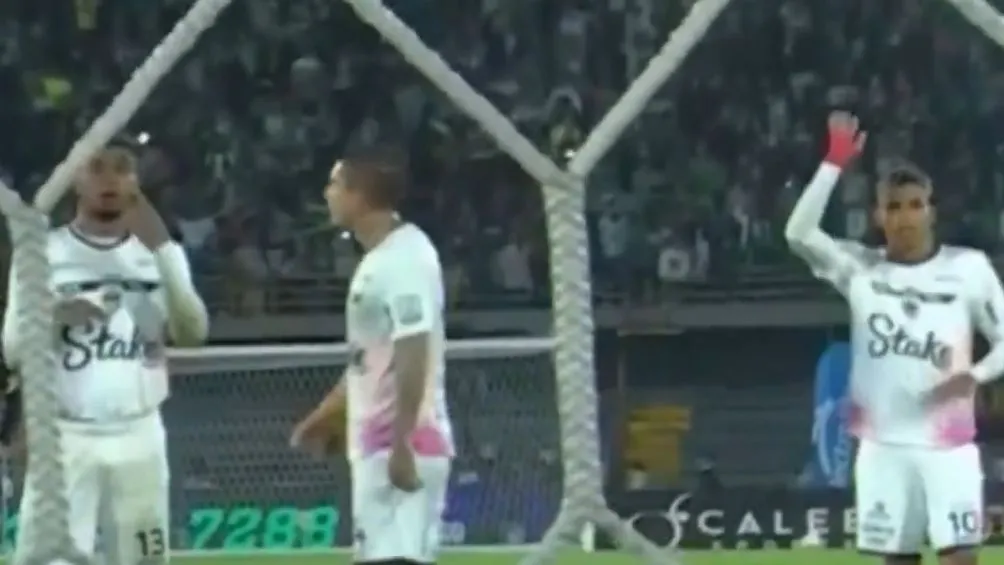 Los jugadores de Fortaleza CEIF avisándole a su arquero que Edwin Cardona iba a picar el penal.