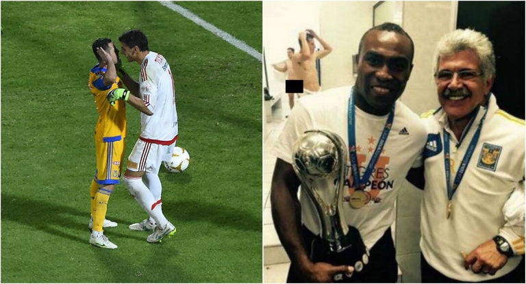 Todo sucedió durante los festejos en el vestidor de Tigres, el delantero y Tuca aparecen con el trofeo del Apertura 2015, pero el autor de la imagen no se percató de que en el fondo, aparece el zaguero tal y como 'dios los trajo al mundo'.