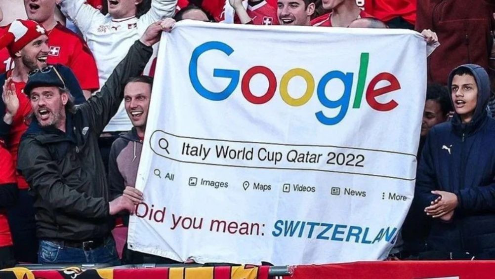 "Italia Copa del Mundo Qatar 2022", se leía en una lona con la interfaz del buscador Google; de bajo se podía leer: "¿Quiso decir Suiza?", complementaba la broma suiza.