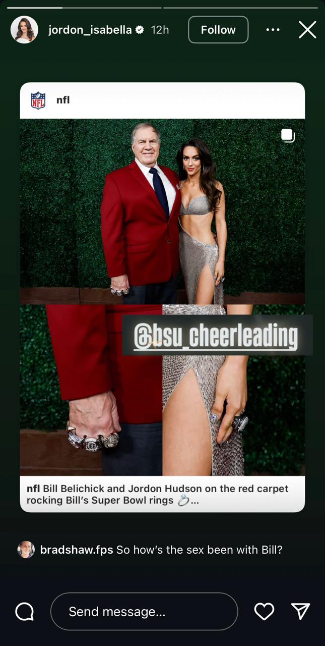 En la fotografía publicada en la cuenta de Instagram de la NFL, Belichick exhibió sus siete anillos de Super Bowl. Sin embargo, la exanimadora añadió a su historia de Instagram una imagen en la que llevaba otro tipo de anillo, lo que avivó aún más las especulaciones sobre un posible compromiso.