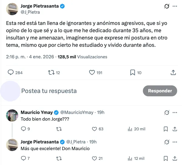 Inmediatamente su publicación se llenó de respuestas, la mayoría de ellas negativas hacia él y sus palabras; sin embargo, hubo una en especial que ha llamado bastante la atención, pues Mauricio Ymay, excompañero suyo en distintas ocasiones, optó por preguntarle a "Don Pietra" si todo estaba bien, a lo que el relator respondió: "Más que perfecto, Don Mauricio".