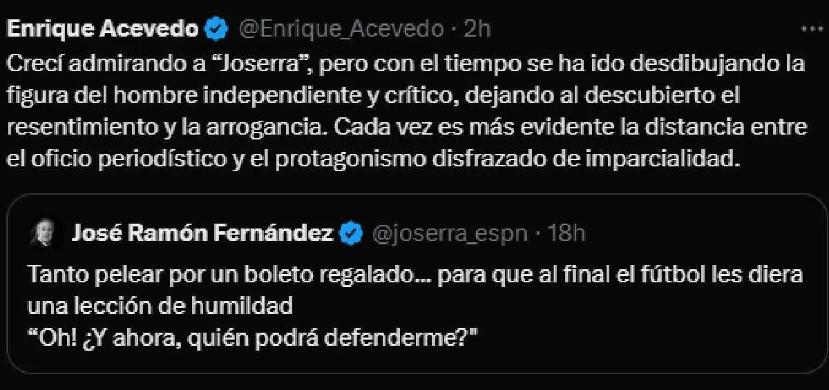 Ese comentario caló hondo en los americanistas y fue Enrique Acevedo quien cayó en la probación y respondió: “Crecí admirando a “Joserra”, pero con el tiempo se ha ido desdibujando la figura del hombre independiente y crítico, dejando al descubierto el resentimiento y la arrogancia”.