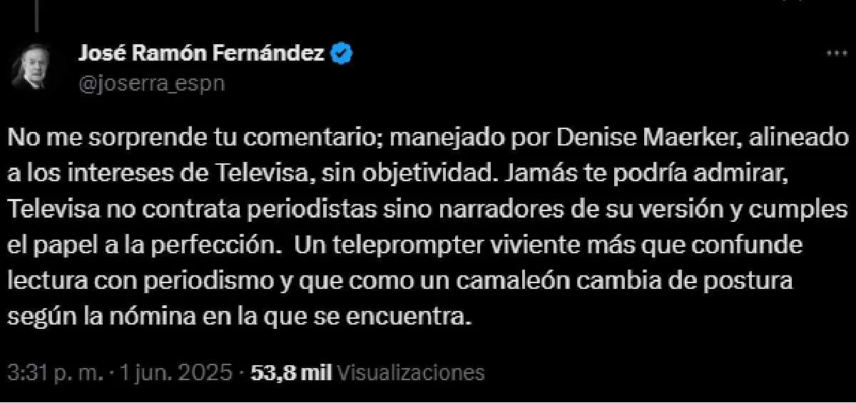 “No me sorprende tu comentario; manejando por Denise Maerker, alineado a los intereses de Televisa, sin objetividad. Jamás te podría admirar, Televisa no contrata periodistas sino narradores de su versión y cumples el papel a la perfección…”, resalta.