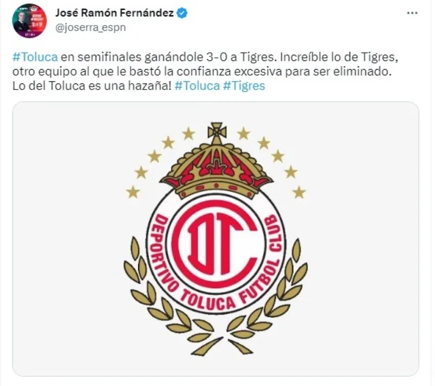 “Toluca en Semifinales ganándole 3-0 a Tigres. Increíble lo de Tigres, otro equipo al que le bastó la confianza excesiva para ser eliminado. Lo del Toluca es una hazaña”, había escrito Joserra en su cuenta de Twitter.