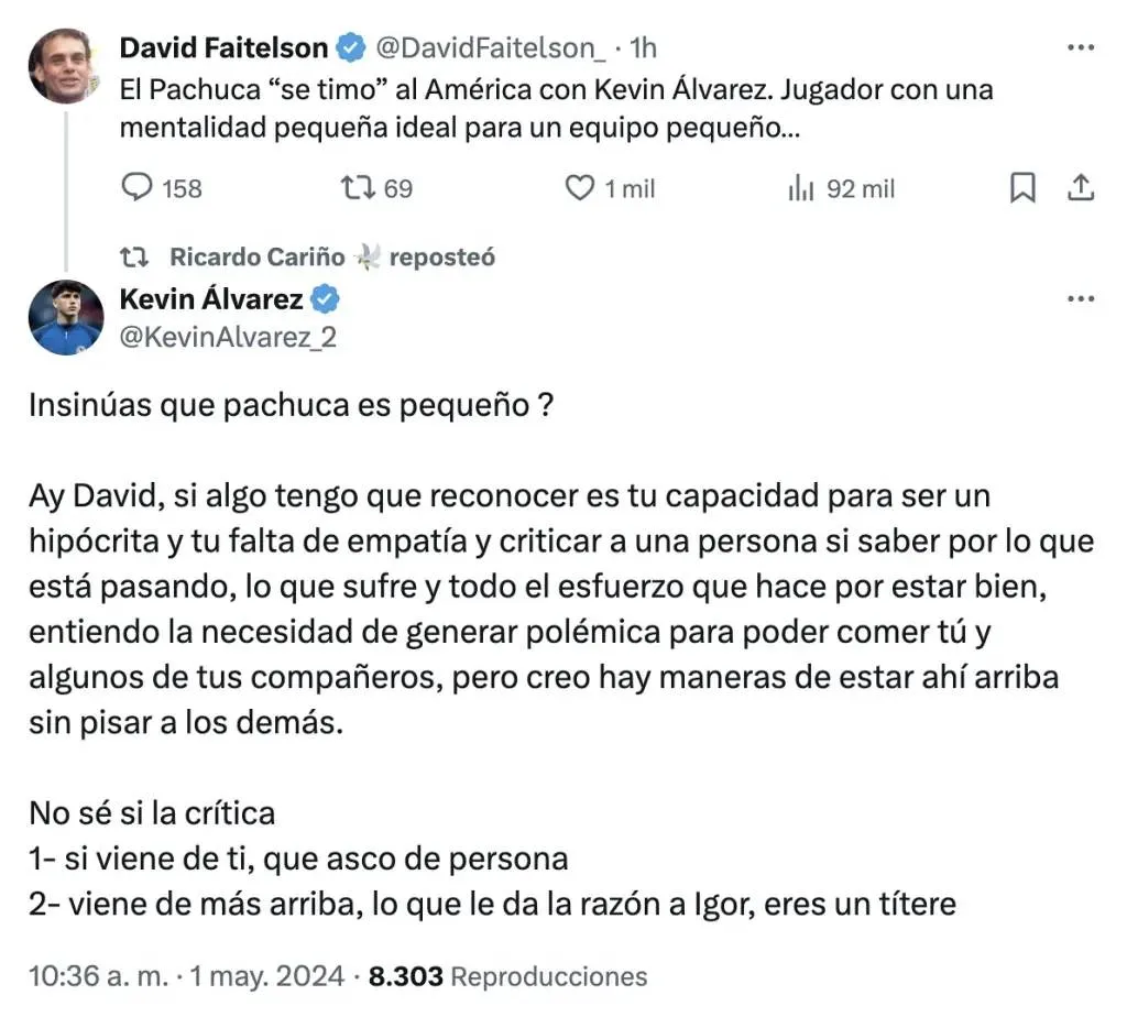 "El Pachuca 'se timó' al América con Kevin Álvarez. Jugador con una mentalidad pequeña, ideal para un equipo pequeño", a los que Kevin le contestó: "¿Insinúas que Pachuca es pequeño? Ay David, si algo tengo que reconocer es tu capacidad de ser un hipócrita y tu falta de empatía y criticar a una persona sin saber por lo que está pasando, lo que sufre y todo el esfuerzo que hace por estar bien, entiendo la necesidad de hacer polémica para poder comer tú y algunos de tus compañeros, pero creo que hay maneras de estar arriba sin pisar a los demás. No sé si la crítica 1. Sí, viene de ti, que asco de persona. 2. Viene de más arriba, lo que le da la razón a Igor, eres un títere", se lee en el comentario de Álvarez.
