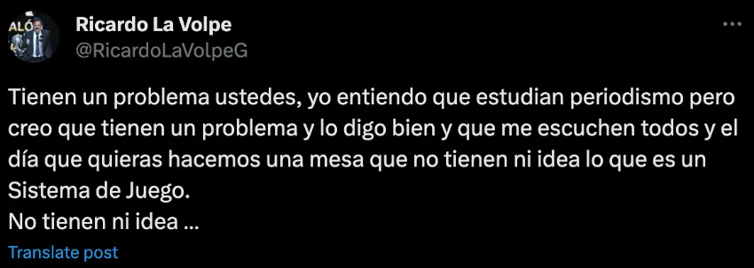 “Tienen un problema ustedes, yo entiendo que estudian periodismo, pero creo que tienen un problema y lo digo bien, y que me escuchen todos y el día que quieras hacemos una mesa que no tienen ni idea lo que es un sistema de juego. No tienen ni idea”, escribió 'El Bigotón'.