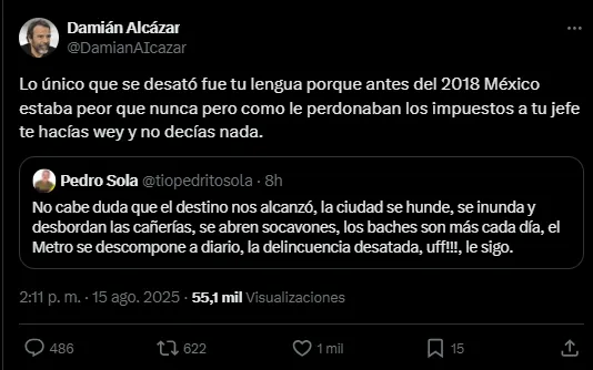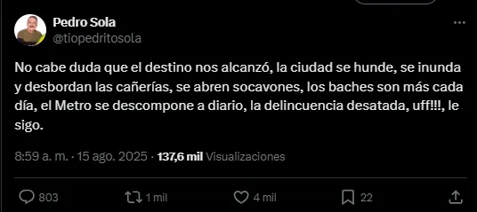Pedro Sola hizo el siguiente posteo: “No cabe duda que el destino nos alcanzó, la ciudad se hunde, se inunda y desbordan las cañerías, se abren socavones, los baches son más cada día, el metro se descompone a diario, la delincuencia desatada, uff!!!, le sigo.