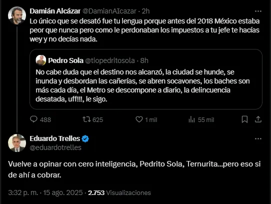 Eduardo Trelles, quien se ha alejado de los medios de comunicación, ahora en otra faceta de su vida ha reaparecido de manera sorpresiva tras arremeter contra el posteo en redes sociales de Pedro Sola quien remarcó las malas condiciones de la CDMX.