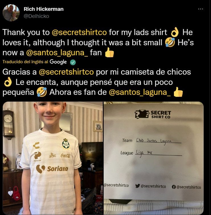 “Gracias a Secret Shirt Co por mi camiseta, chicos. Le encanta, aunque pensé que era un poco pequeña. Ahora es fan de Santos Laguna”, escribió el padre del pequeño que no pudo ocultar su felicidad por recibir este regalo de navidad.