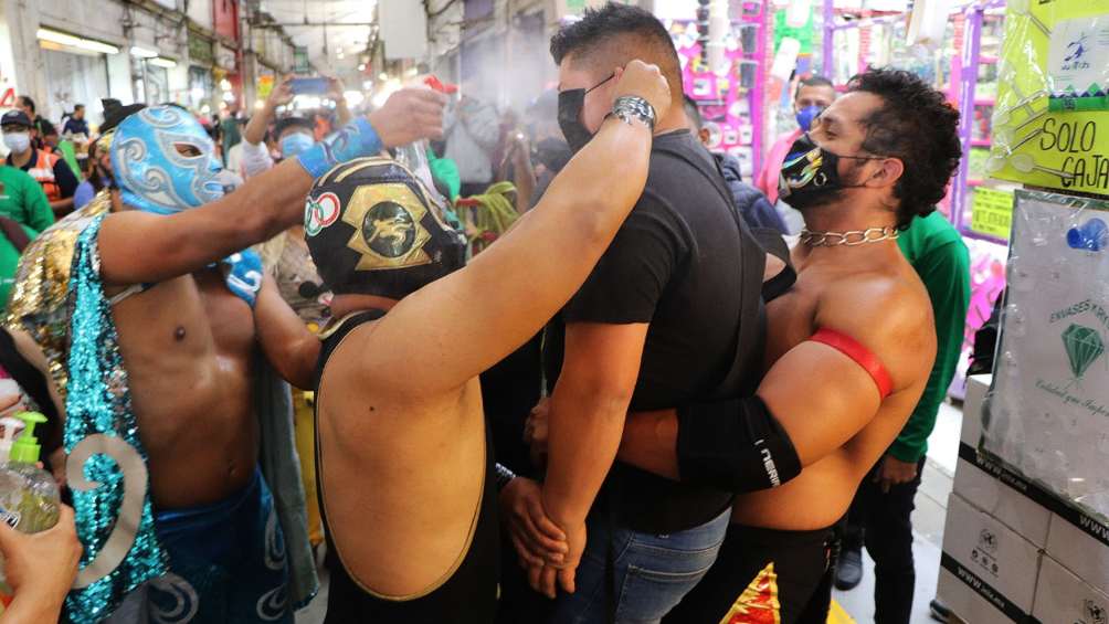 A través de sus redes sociales, la Central de Abastos dio a conocer que por los pasillos del mercado se encotraban luchadores como Hijo de Ciclón Ramírez, Espectro Jr, Hijo del Pirata Morgan y Bandido, quienes abordaban a las personas que no utilizaban mascarilla para 'enmascararlos'