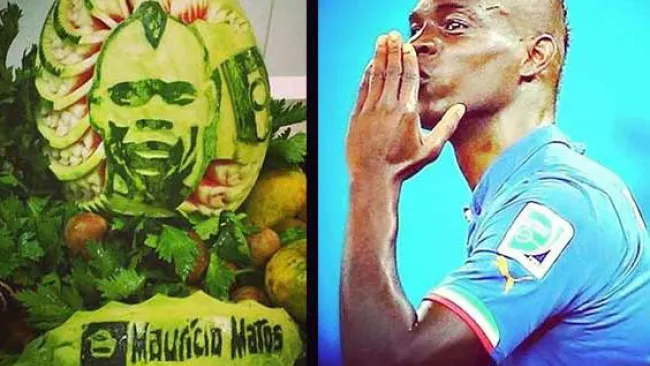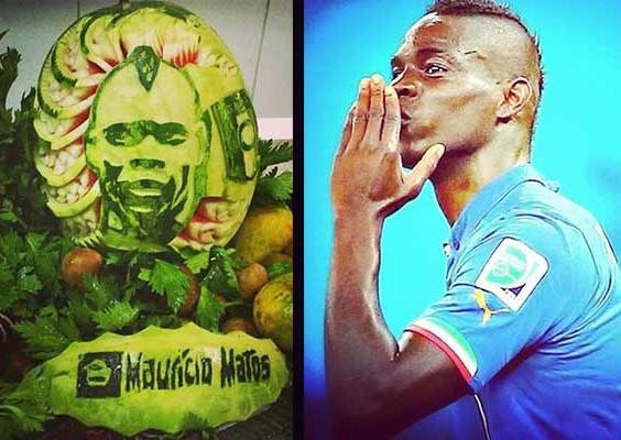 Mario Balotelli, delantero de la selección italiana, recibió una escultura con su rostro hecho en una sandía como obsequio del artista Mauricio Matos en su concentración en la ciudad de Mangaratiba (Brasil).