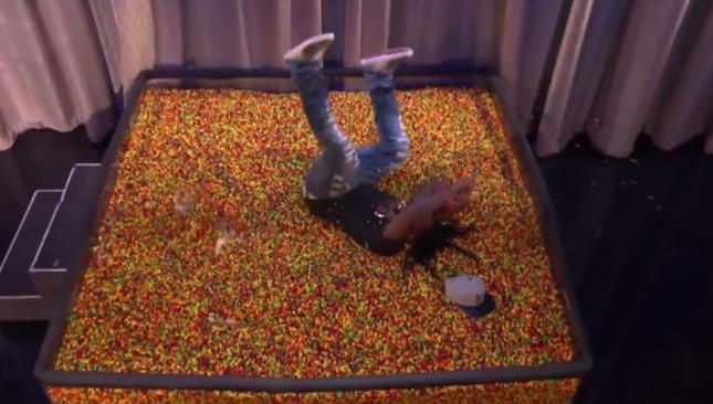 En los momentos finales de la intervención en el programa 'Conan', una cortina se abrió revelando una alberca repleta con los dulces preferidos de Lynch y éste saltó en ella simulando que atrapó un pase en la zona de anotación.