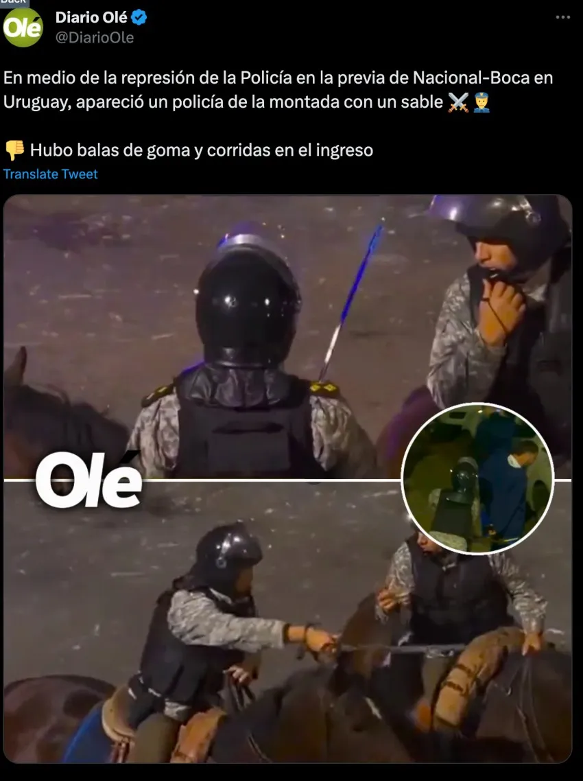Montado en su caballo y con la espada a muestra del público, el oficial fue captado aprendiendo a la gente, aunque hasta de momento no se reportan lesionados por el utilizar dicha arma previo a un juego de la Copa Libertadores.