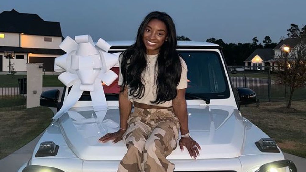 Biles adquirió su nuevo vehículo, un Mercedes-Benz blanco que posó con enorme moño ante sus mas 12 millones de seguidores en redes sociales y de paso resaltó dejar su viejo vehículo negro.