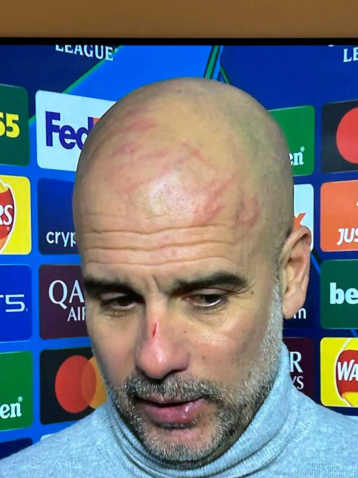 Luego de este empate (que fue más sabor a derrota para los ingleses) el técnico de los ciudadanos, Pep Guardiola, salió a declarar con los medios y se le vio lastimado en la cabeza y en la nariz.