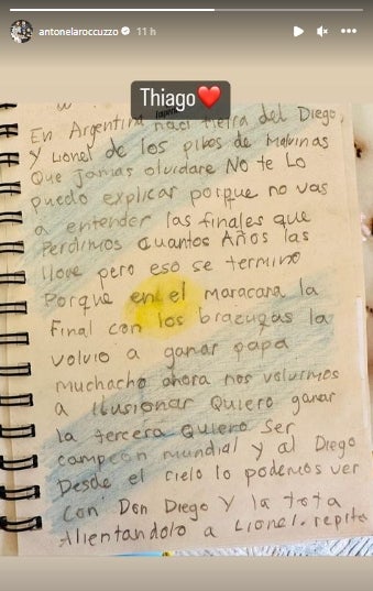 A horas de que Argentina dispute una Final del Mundial más, toda la motivación sigue desbordándose. Thiago, el hijo de Lionel Messi y Antonela Roccuzzo, escribió la letra del famoso cántico ‘Muchachos’ en su cuaderno.