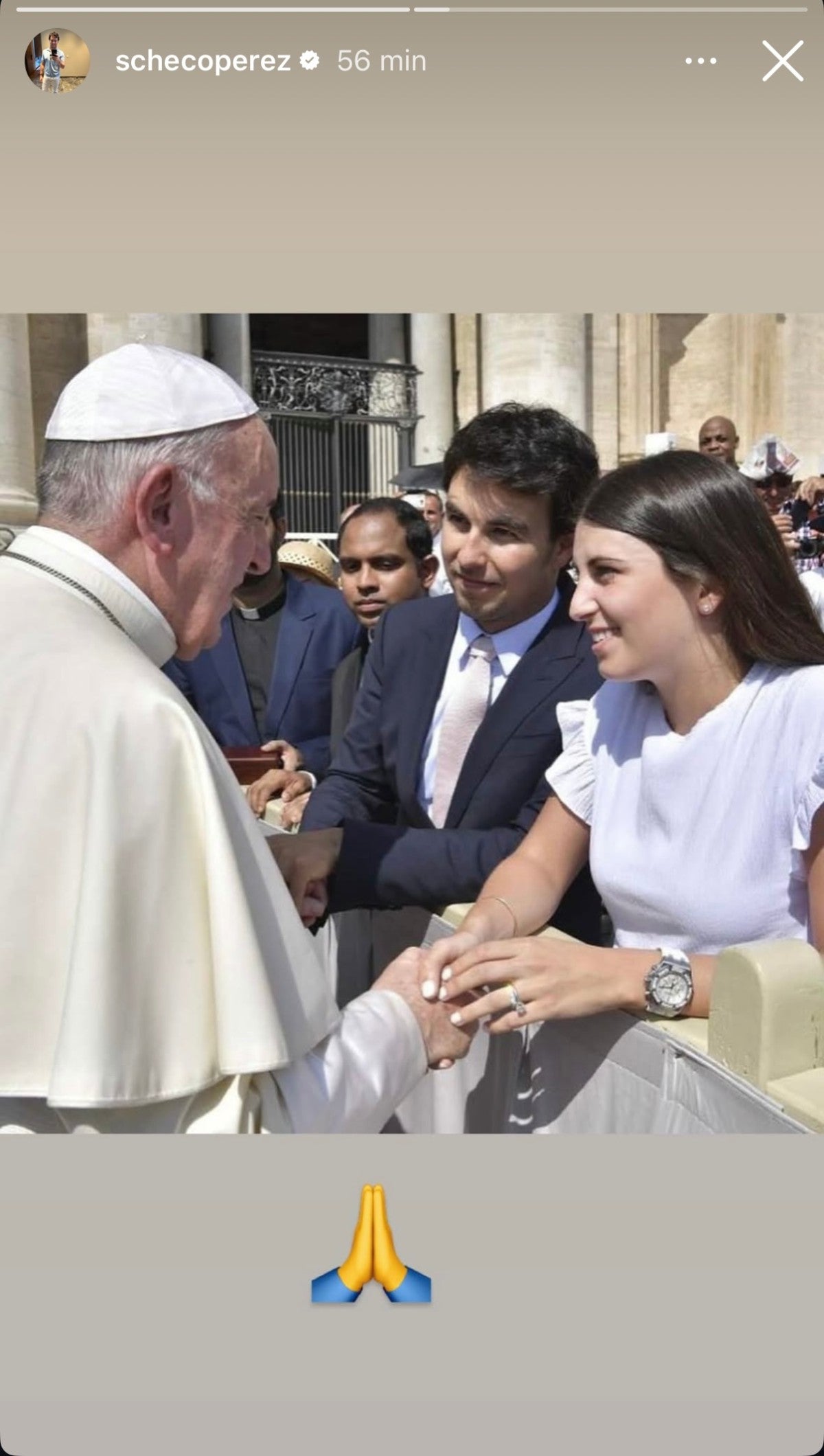 En 2018, Sergio ‘Checo’ Pérez, acudió a la Audiencia General del Vaticano; acompañado por su esposa Carola. La pareja pudo conocer al Papa Francisco y saludarlo de mano, con un gran cariño.