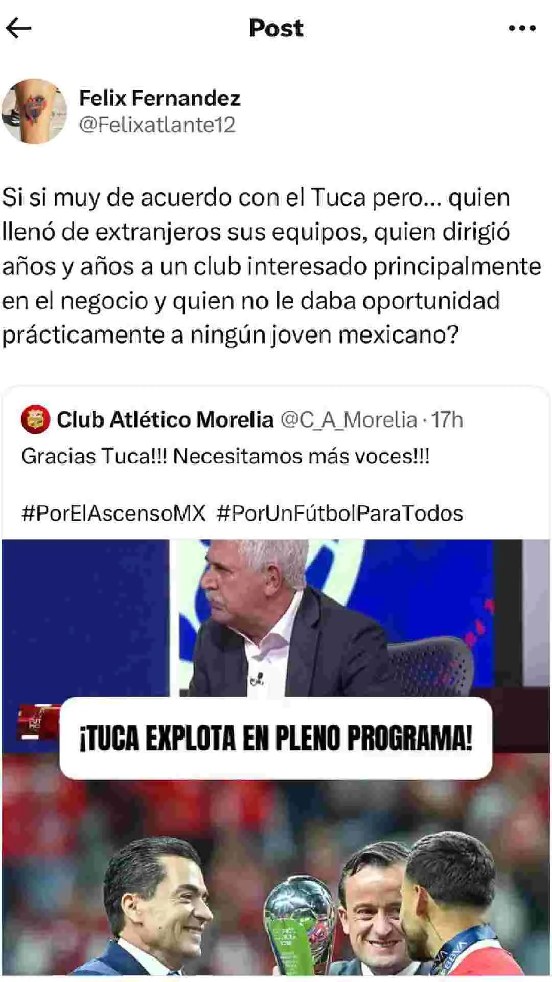 Aficionados se lanzaron sobre el comentarista deportivo quien habló en la mesa pero como DT hizo todo lo contrario y entre ellos apareció el exportero Félix Fernández: “Si si muy de acuerdo con el Tuca…pero quién llenó de extranjeros sus equipos…”