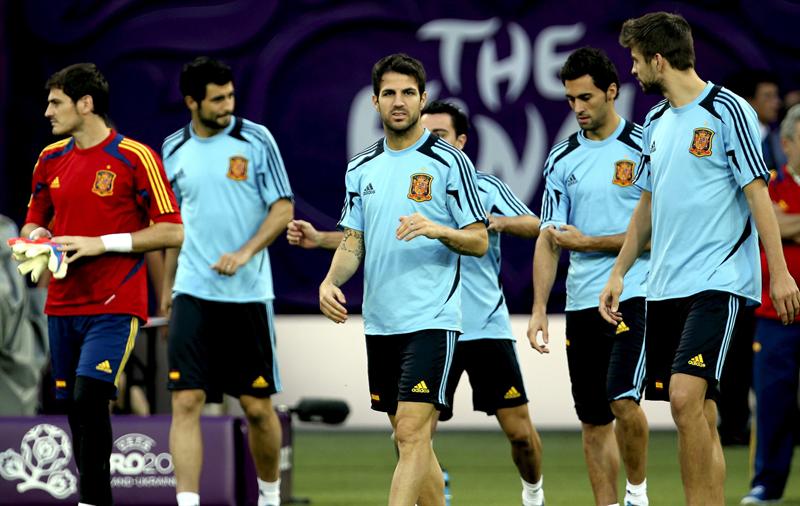 Casillas, Cesc Fábregas y Piqué durante la practica l EFE