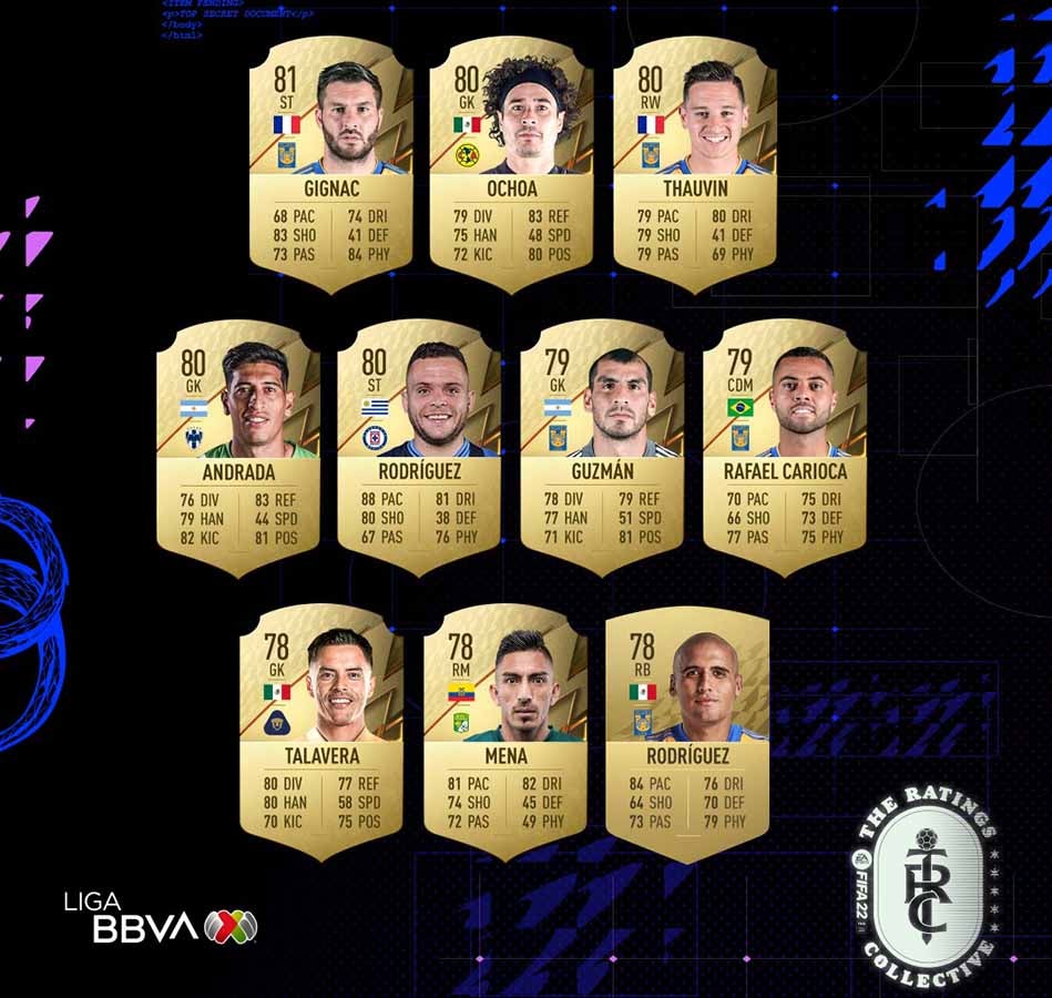 Le siguen Guillermo Ochoa del América, Florian Thauvin de Tigres, Esteban Andrada de Monterrey y Jonathan Rodríguez de Cruz Azul. Todos estos jugadores tienen una valoración de 80. El guardameta de las Águilas ha tenido destacadas actuaciones desde que regresó de Europa y apunta a ser el titular de la Selección Mexicana en la Copa del Mundo de Qatar 2022.