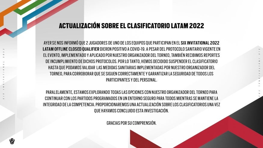 “Ayer se nos informó que 2 jugadores de uno de los equipos que participan en el Six Invitational 2022 dieron positivo por Covid-19 (…), también recibimos reportes de incumplimiento de dichos protocolos, por lo tanto, hemos decidido suspender el clasificatoria hasta que podamos validar las medidas sanitarias”, se lee en el comunicado por parte de la organización del evento.