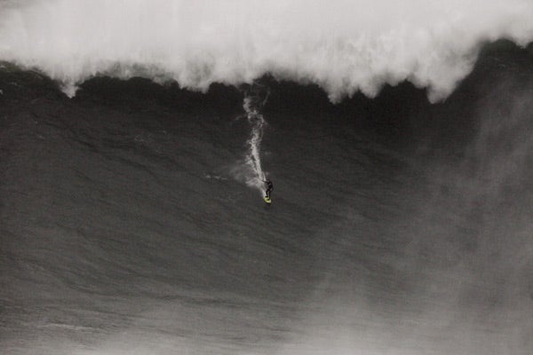El brasileño Carlos Burle navegó una ola gigante en la playa lusa de Nazaré, que puede haber acabado con el récord mundial del estadounidense Garret Mcnamara.